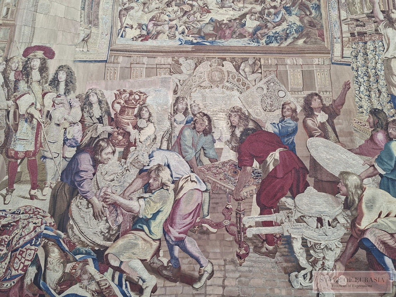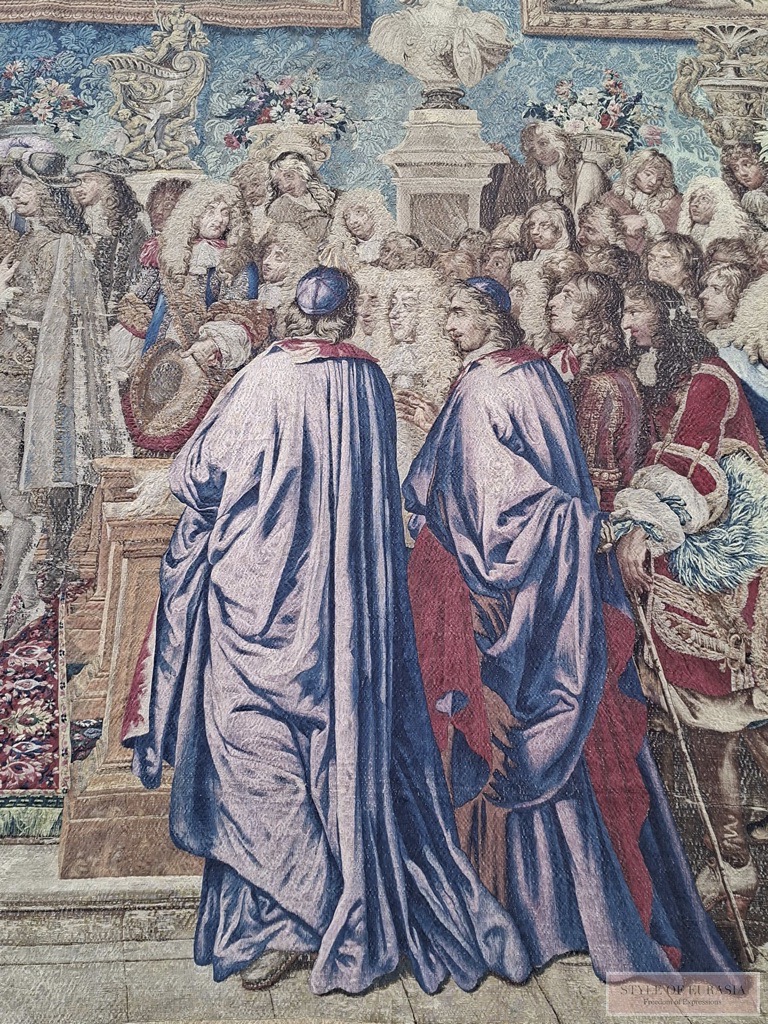 To evoke the 17th-century Grande Galerie, the Grand Palais has displayed the "Story of the King" hangings in parallel. These were woven at the Gobelins (1665–1681), also based on cartoons by Charles Le Brun, created with painter Adam Frans Van der Meulen and eight master cartoonists across 14 episodes.