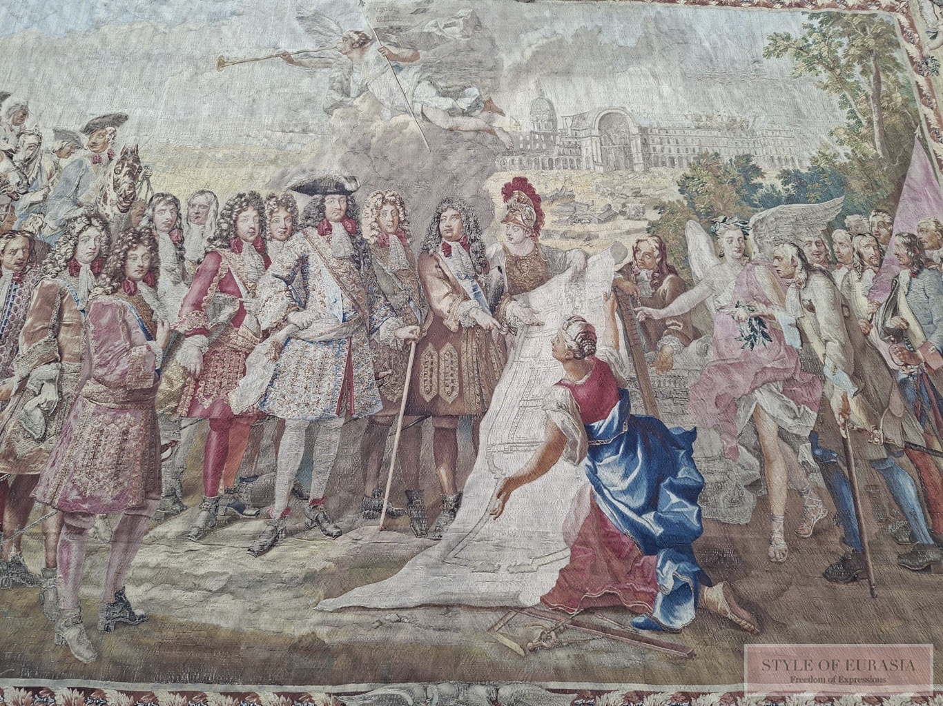 Судьба этого невероятного ансамбля была полна превратностей: его вновь чествовали при Наполеоне, раздаривали в качестве дипломатических подношений, разрезали и распродавали. Некоторые фрагменты удостоились чести украшать посольства и высшие кабинеты власти (включая рабочий стол Президента Республики) или становиться фоном для великих событий, таких как подписание Версальского договора в 1919 году. До наших дней сохранился лишь 41 ковер, и около тридцати из них представлены на этой выставке.