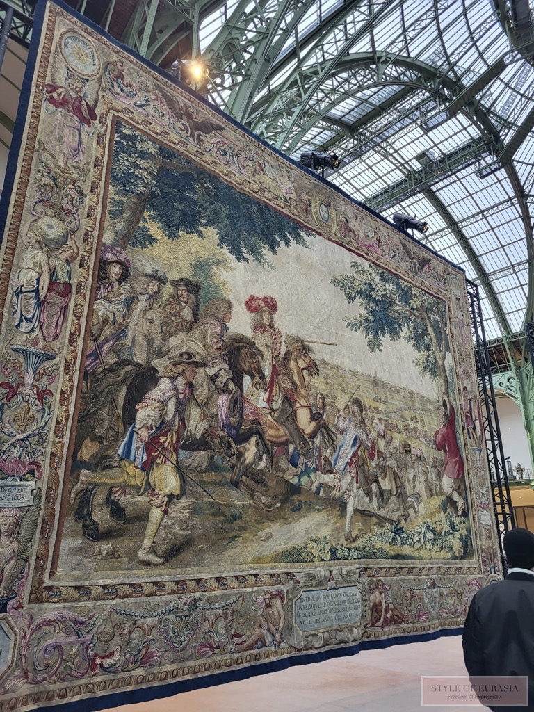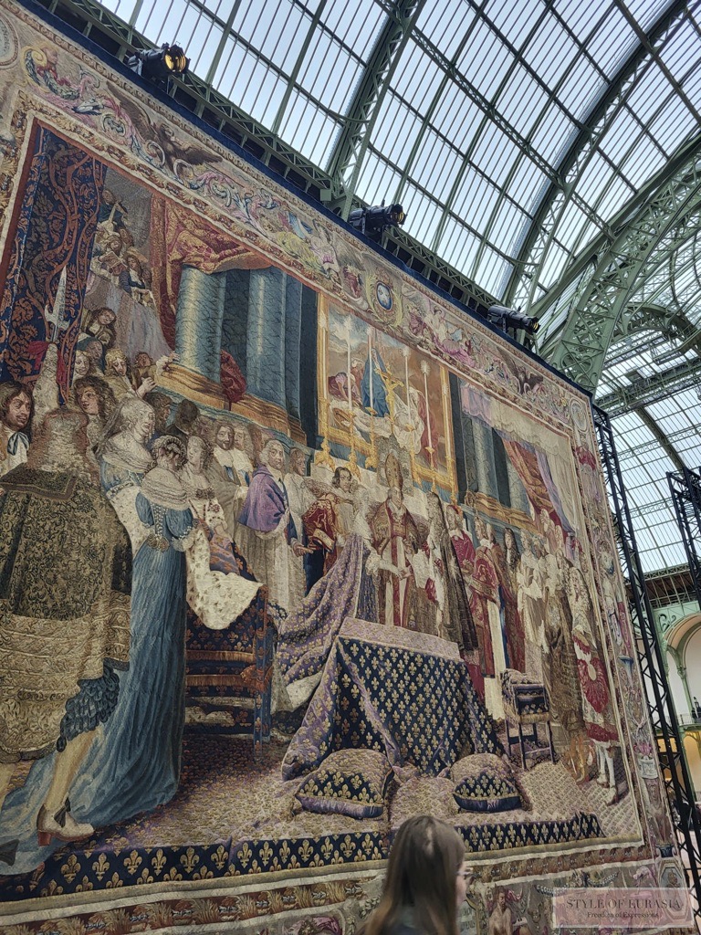 Чтобы воссоздать облик Большой галереи Лувра XVII века, Гран-Пале разместил напротив ковров серию шпалер «История короля». Они были сотканы на мануфактуре Гобеленов (1665–1681) также по эскизам Шарля Лебрена при участии батального живописца Адама Франса ван дер Мейлена и восьми мастеров-картонщиков в 14 эпизодах.