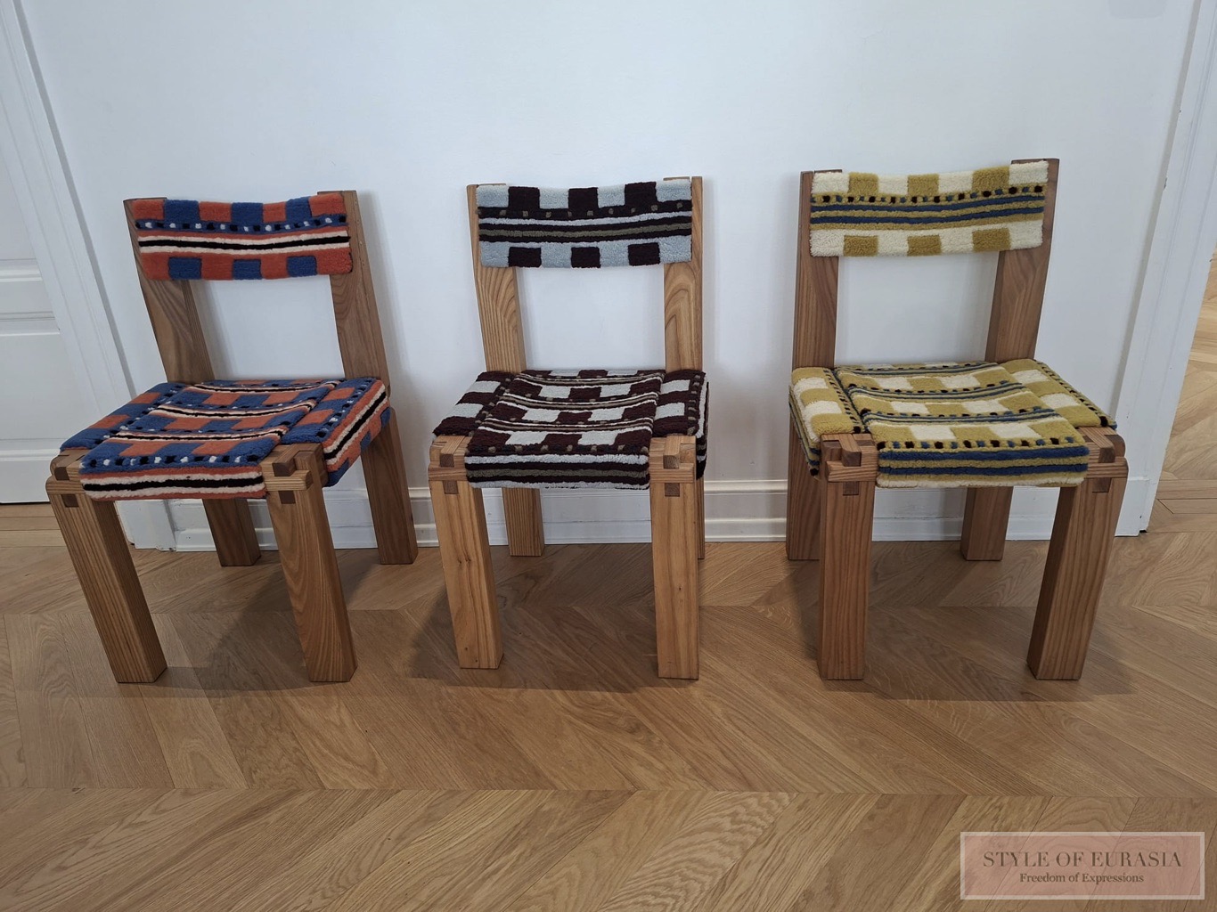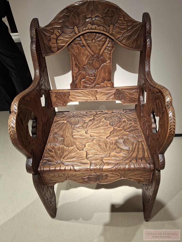Art Nouveau appears here and there — for example, in a Japanese-produced chair in the Liberty style, circa 1900 (Galerie Pron, Paris), or in a full ensemble by Carlo Bugatti (extended in the Yves Salomon Editions showroom). The 1940s are well represented through the carved wood pieces and joyful ironwork of Joseph Savina, a close friend of Le Corbusier (Galerie Downtown, Paris). The 1970s make an appearance with narrow, high-backed chairs upholstered in checkered fabrics in shades of brown at Galerie Damien Tison (Paris).