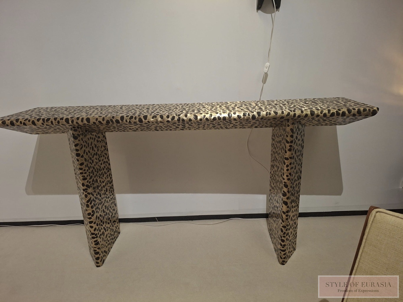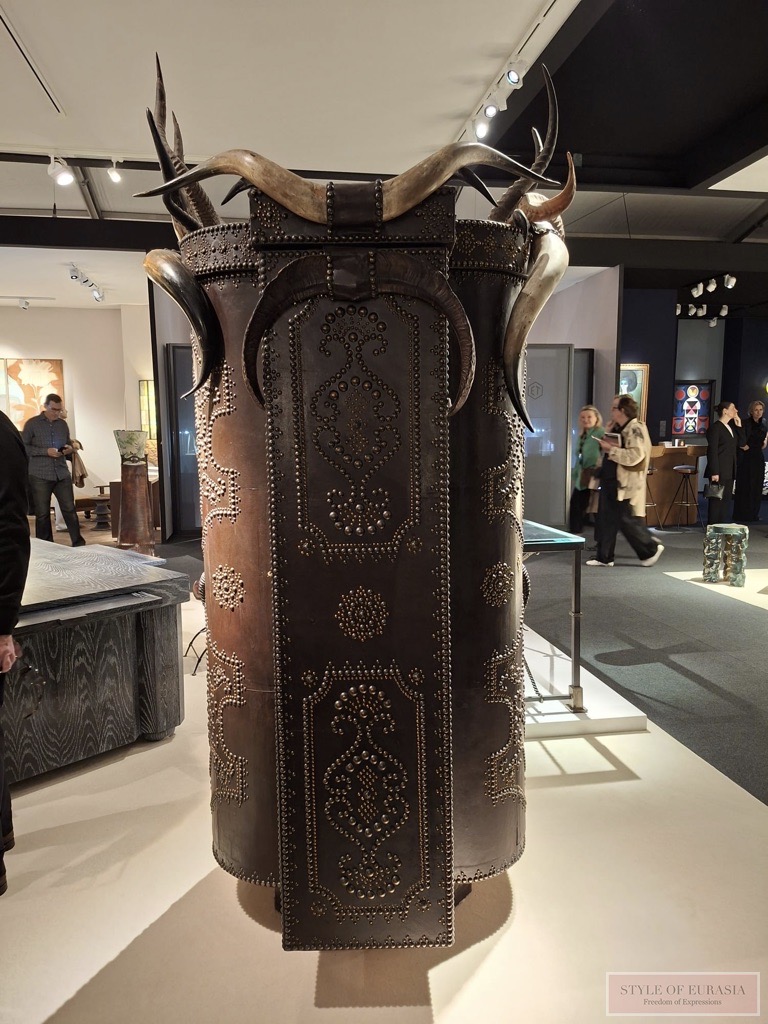 Contemporary design continues to expand its presence, increasingly overshadowing earlier periods. The metallic poetry of Joy de Rohan-Chabot fills the stand of Galerie Chastel Maréchal (Paris). A silver-patinated cabinet by Alastair Cook dialogues with a set of mirrors by Audiane Delos (Galerie Mougin, Paris). The vibrant cabinet by Achille Salvagni Atelier (Rome) dazzles both inside and out. A translucent resin chair, reminiscent of ice, would perfectly suit an ice hotel (Palaty, Saint Petersburg), while for warmth, the Leopard console by Jean-Baptiste Fastrez (Kréo, Paris) offers a striking solution. Mexican architect Hector Esrawe translates building façades into gear-driven cabinets.