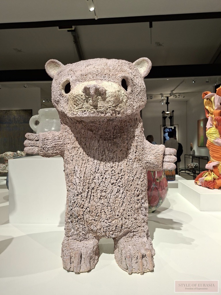 Занавес поднимается над обширным миром керамики. От простых оригами из керамогранита Кариль Дезиль (Galerie Scène Ouverte, Париж) до фигур животных — белого медведя и лягушки — художника середины XX века Андре Розе (Thomas Fritsch Atrium, Париж), а также более игривых работ, включая розового плюшевого мишку Тимоти Юмбе (Florian Daguet-Bresson, Париж), и триптиха-пейзажа из фарфоровых пластин Валерии Исяк (Mia Karlova Galerie, Амстердам). К ним добавляются более утилитарные объекты: кофейный столик Cameron из терракоты и латуни (Galerie Scène Ouverte, Париж), ироничный камин Юбера Ле Галля (Florian Daguet-Bresson, Париж), а также предметы — консоли, столики и бра — Джереми Прадье-Жоно с роскошным зелёным блеском, вдохновлённые эстетикой шагрени.