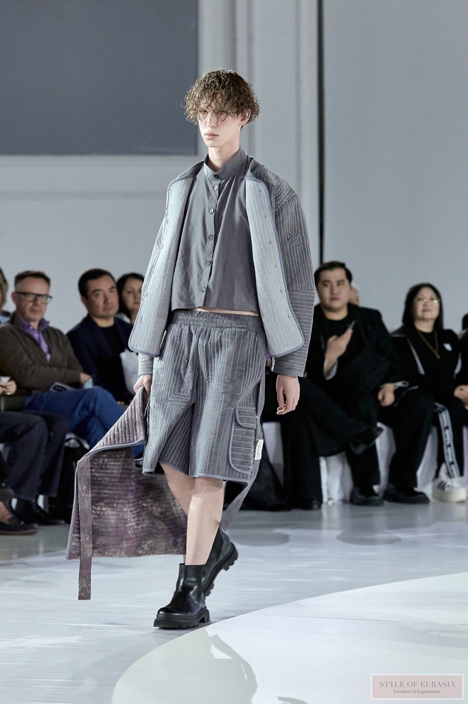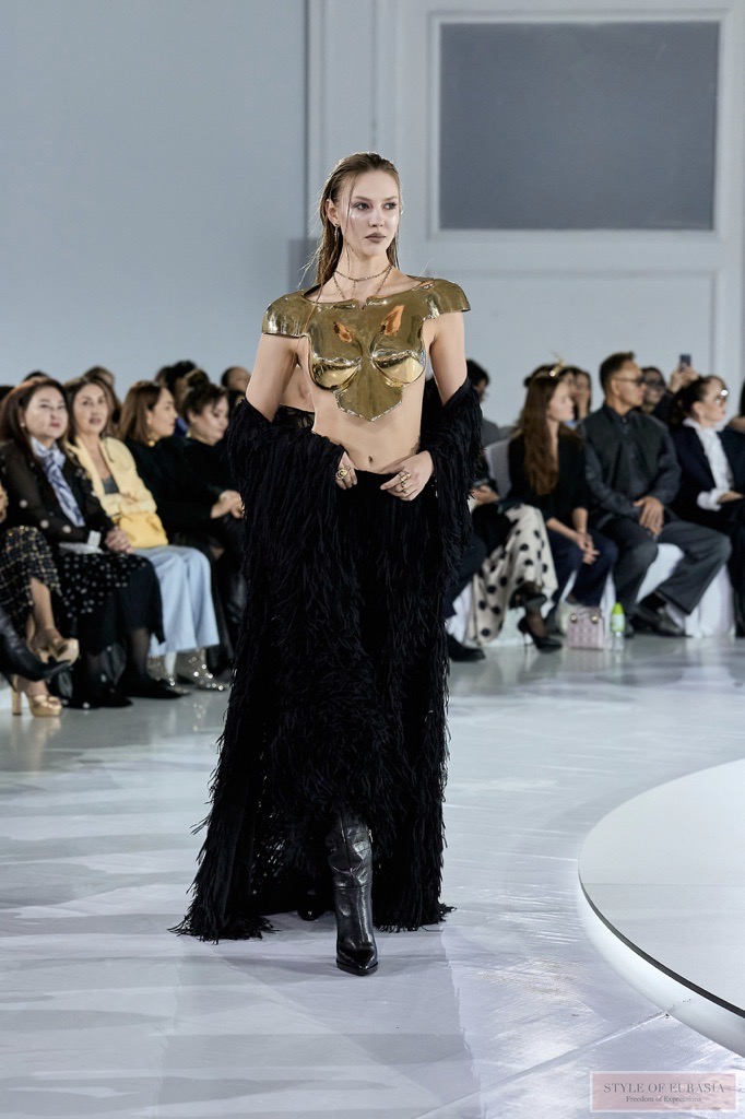 Yerlan Zholdasbek showcased a collection blending Eastern aesthetics with Western dynamism, featuring multilayered compositions, rich textures, and refined handcrafted details.
