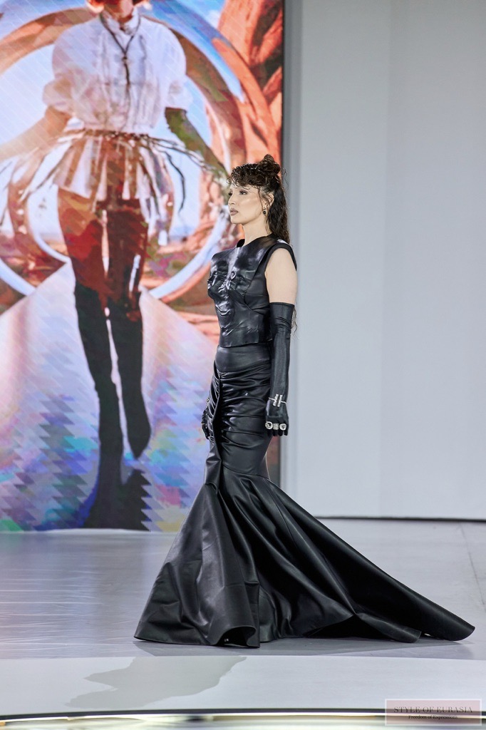 Nayil Baikuchukov с коллекцией «Black Diamond» показал, как строгие линии и контрастные текстуры создают образы сильной, уверенной женщины, где матовые и глянцевые поверхности дополняются мерцающими тканями и ручной вышивкой.