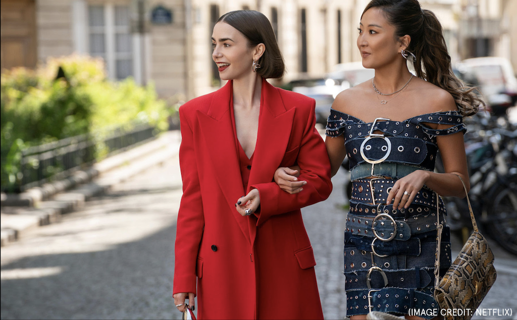 Ещё в четвёртом сезоне, вышедшем в августе прошлого года, Эмили появлялась в чётко скроенном синем костюме Barbara Bui во время поездки в Живерни — образе, который вновь подчеркнул её всё более выверенный парижский стиль.