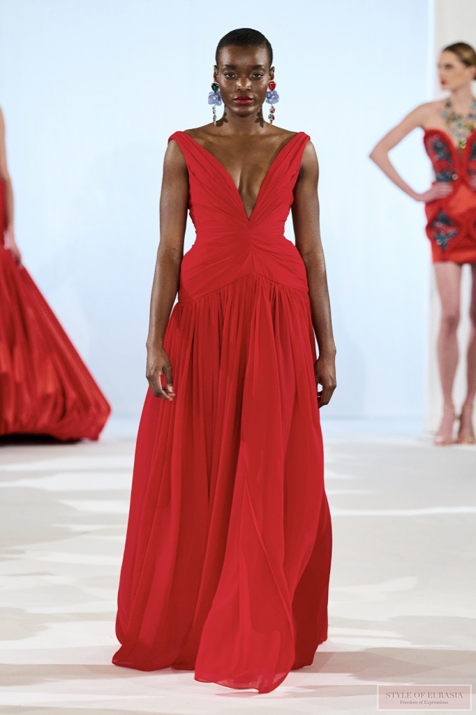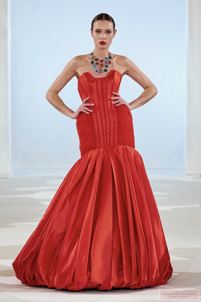 Spanish references unfold with subtle intensity — in the sculptural drape, the dynamic flow of lines, and allusions to flamenco, Mediterranean light, and trencadís mosaics. The color palette moves from ivory and green to deep red and dramatic black, accented by marine blue and muted gold, echoing the tones of Barcelona at sunset, as well as the paintings of Frida Kahlo, through their vivid and joyful hues.