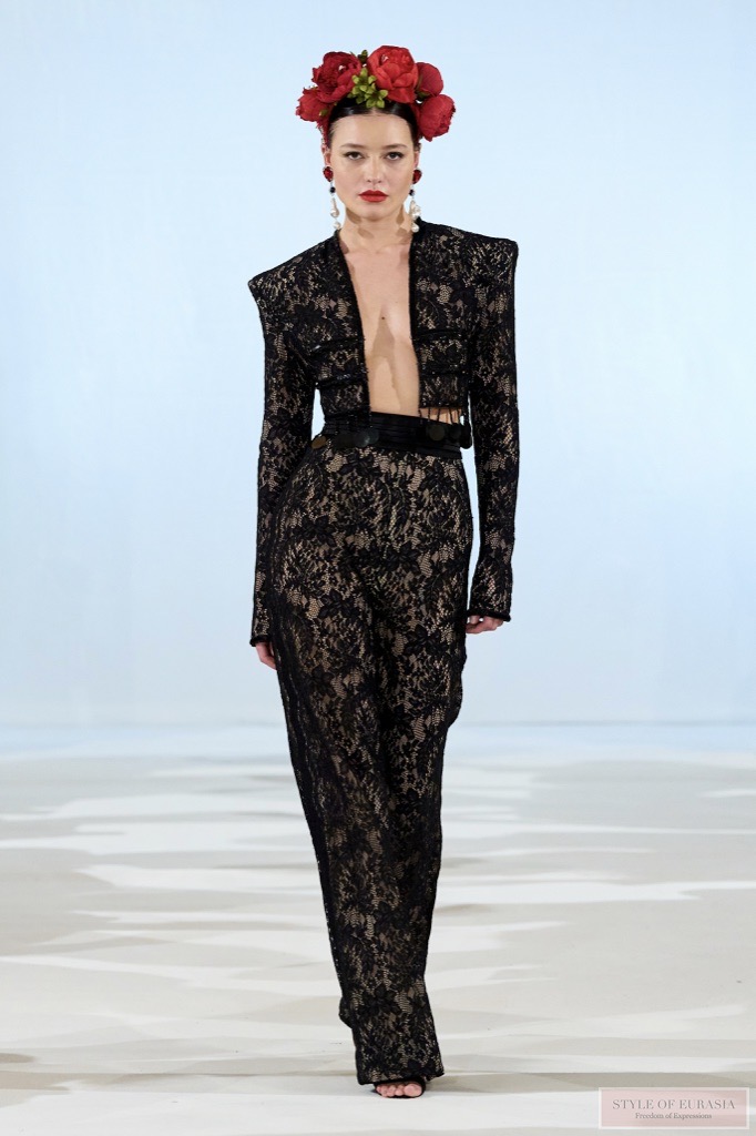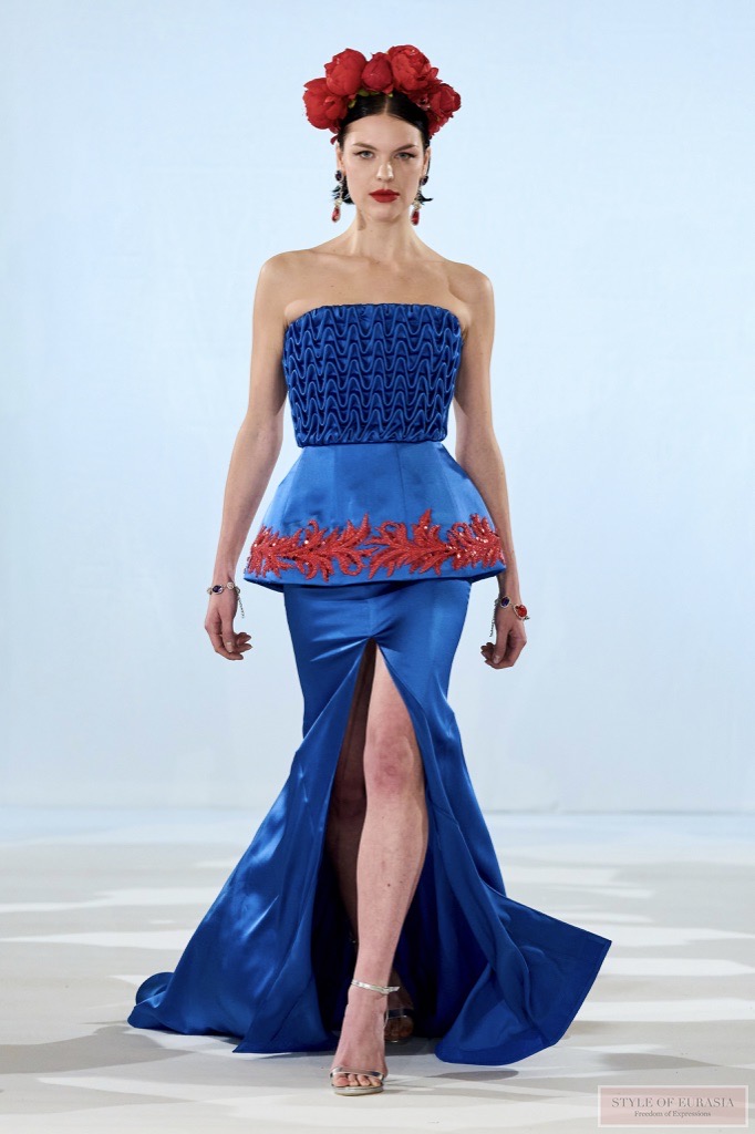 Испанские мотивы раскрываются с тонкой выразительностью — в скульптурной драпировке, динамике линий и отсылках к фламенко, средиземноморскому свету и мозаикам тренкадис. Палитра переходит от оттенков айвори и зелёного к глубокому красному и драматичному чёрному, дополненным морским синим и приглушённым золотом, перекликаясь с красками барселонского заката, а также с живописью Фриды Кало — её яркими и радостными тонами.