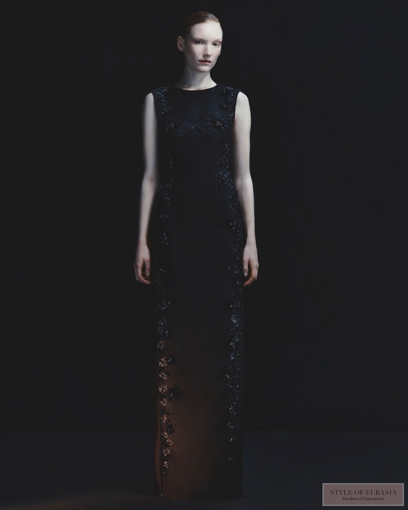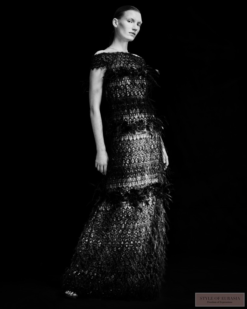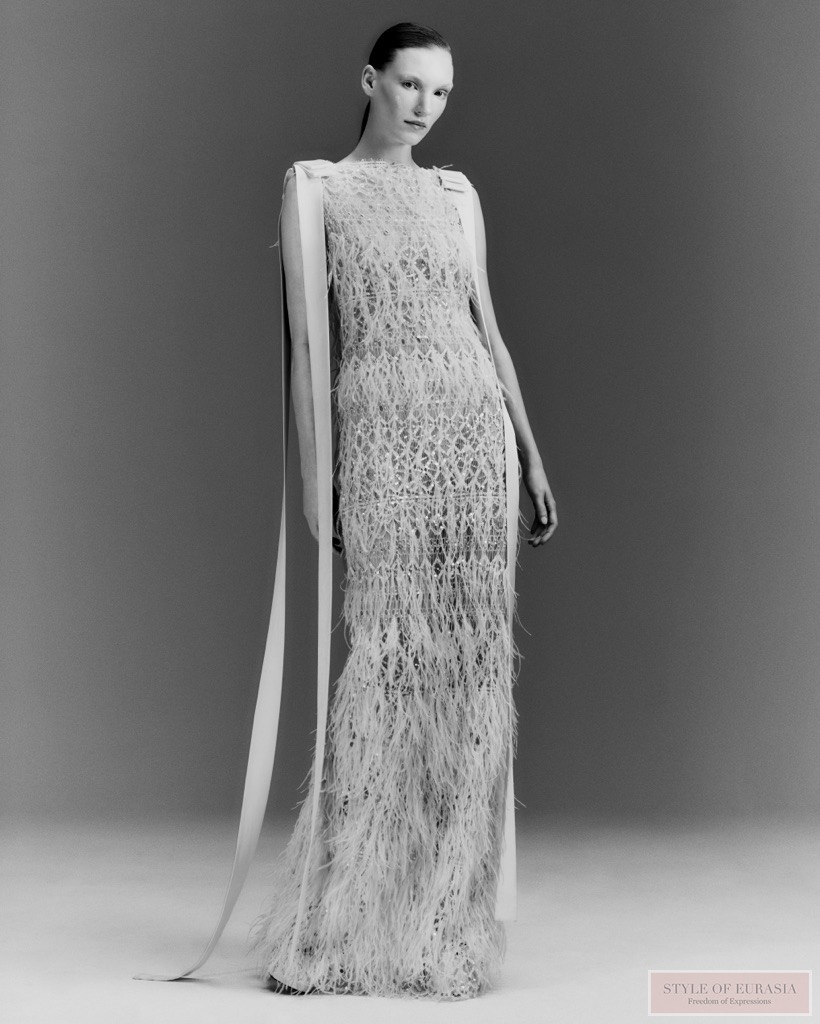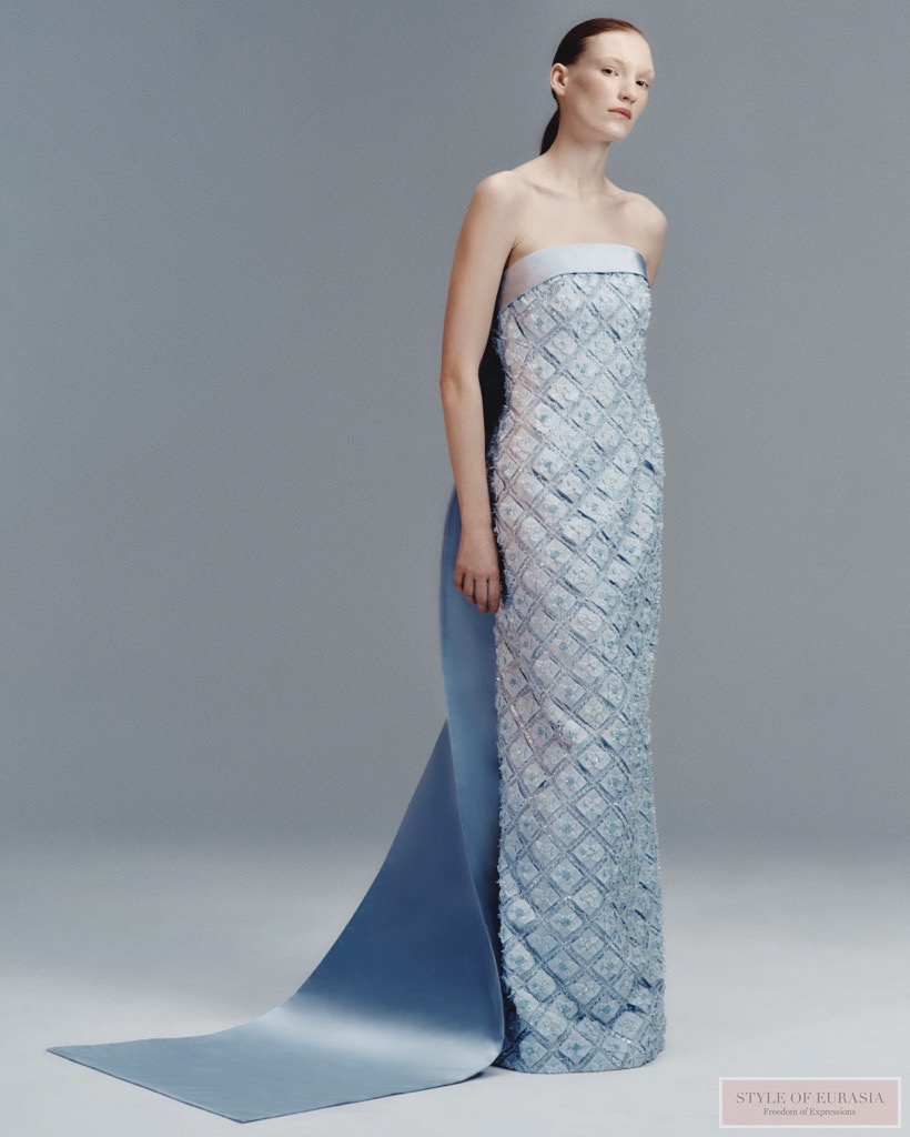 Цветовая палитра развивается сдержанно. В этом сезоне появляются светло-голубые тона, привносящие свежесть и свет к основным черным, белым и красным цветам Дома моды. Эти оттенки оживляют силуэты, подчеркивая их глубину, сохраняя при этом архитектурную мощь Дома.
