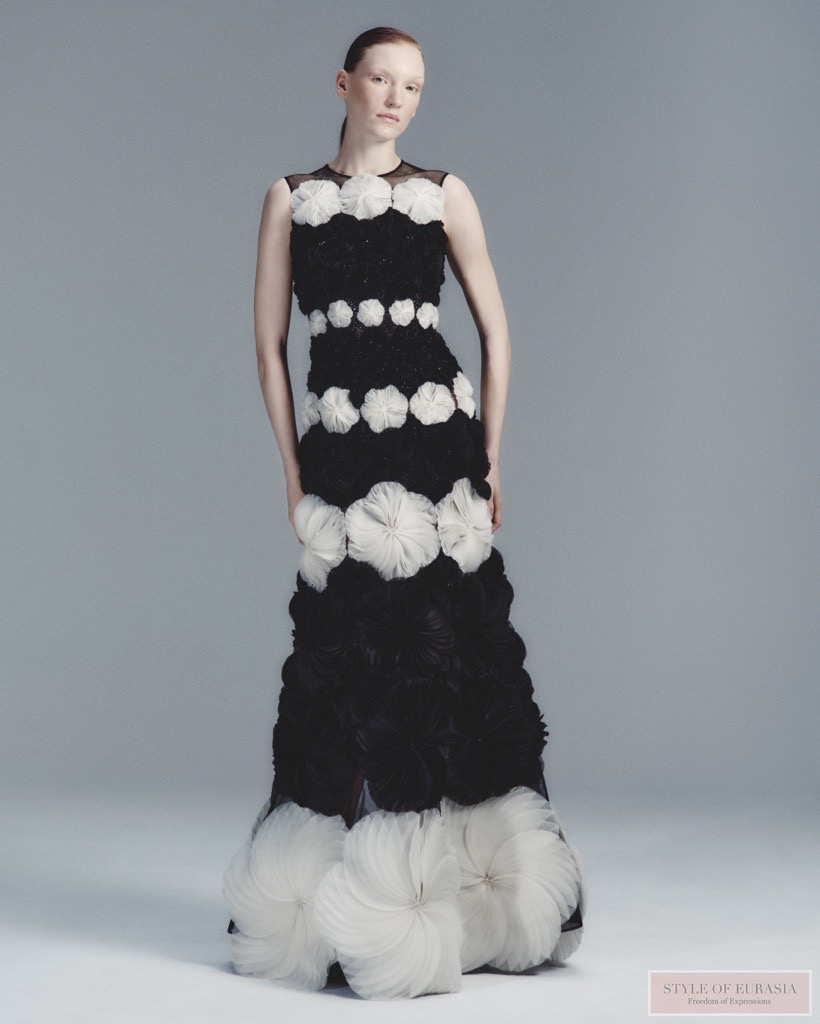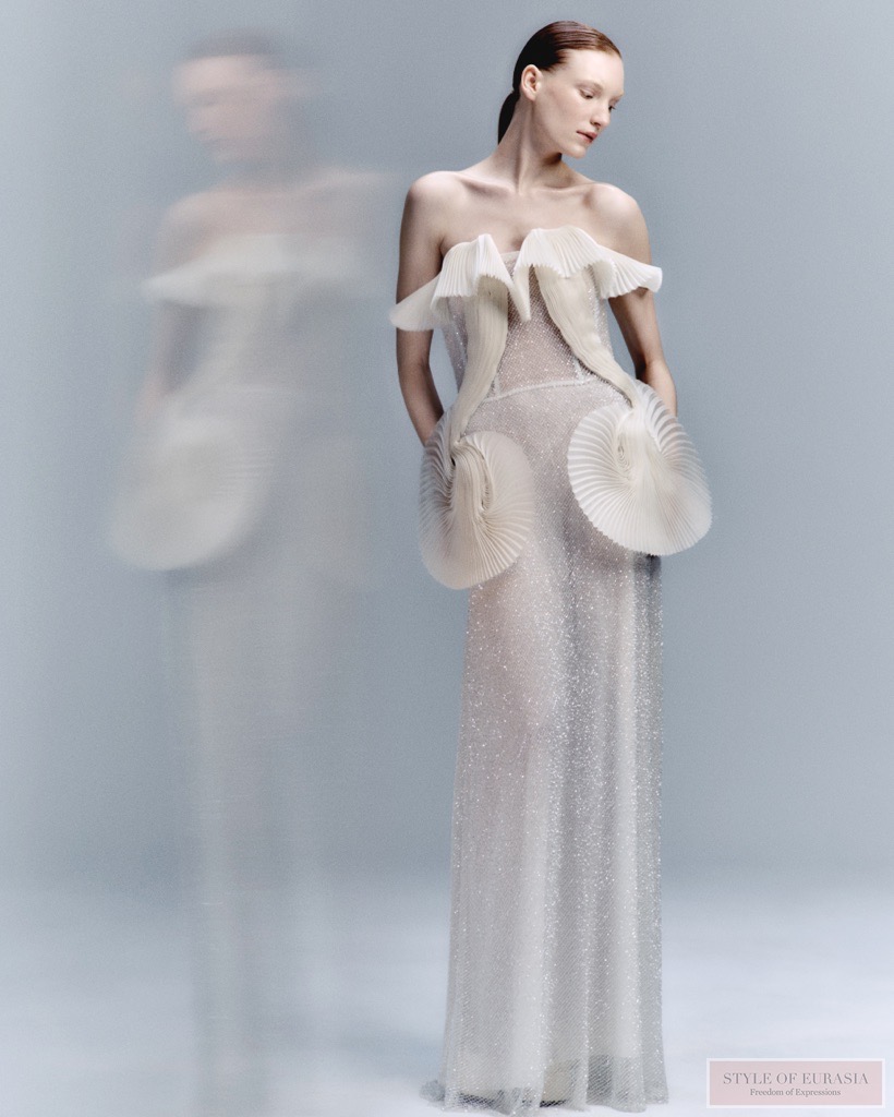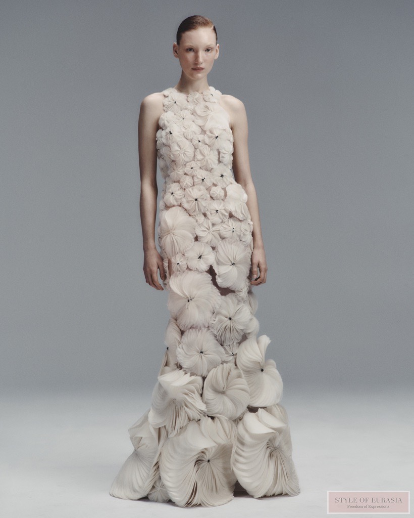For Couture Spring / Summer 2026, Fang Yang extends this signature vocabulary through new origami-inspired shapes and a more exacting approach to construction. The silhouettes reveal greater intricacy and clarity, as structure and movement engage in an increasingly precise dialogue.