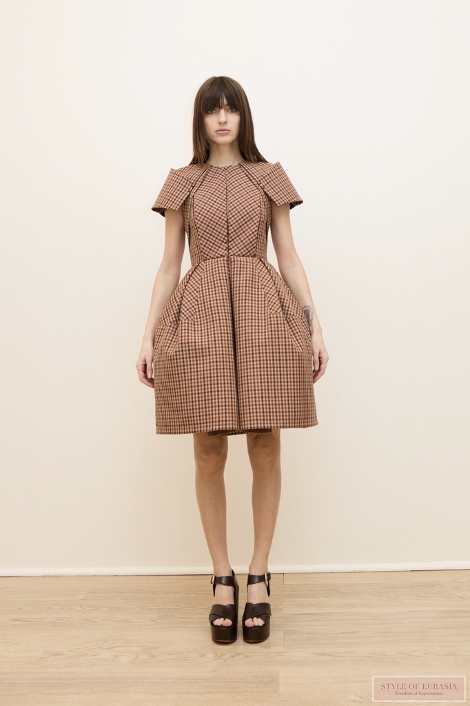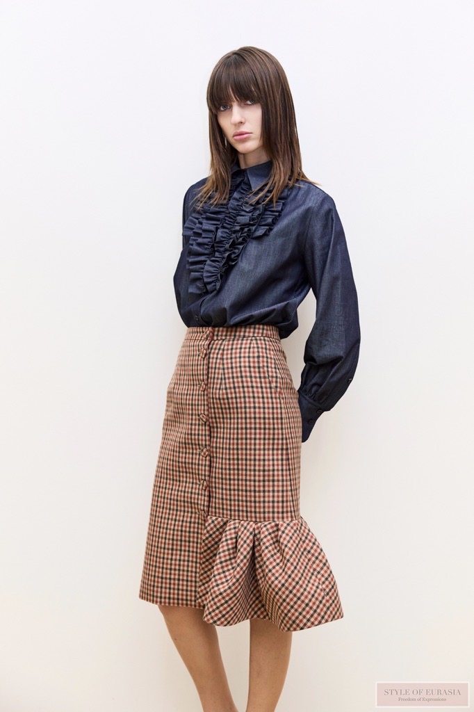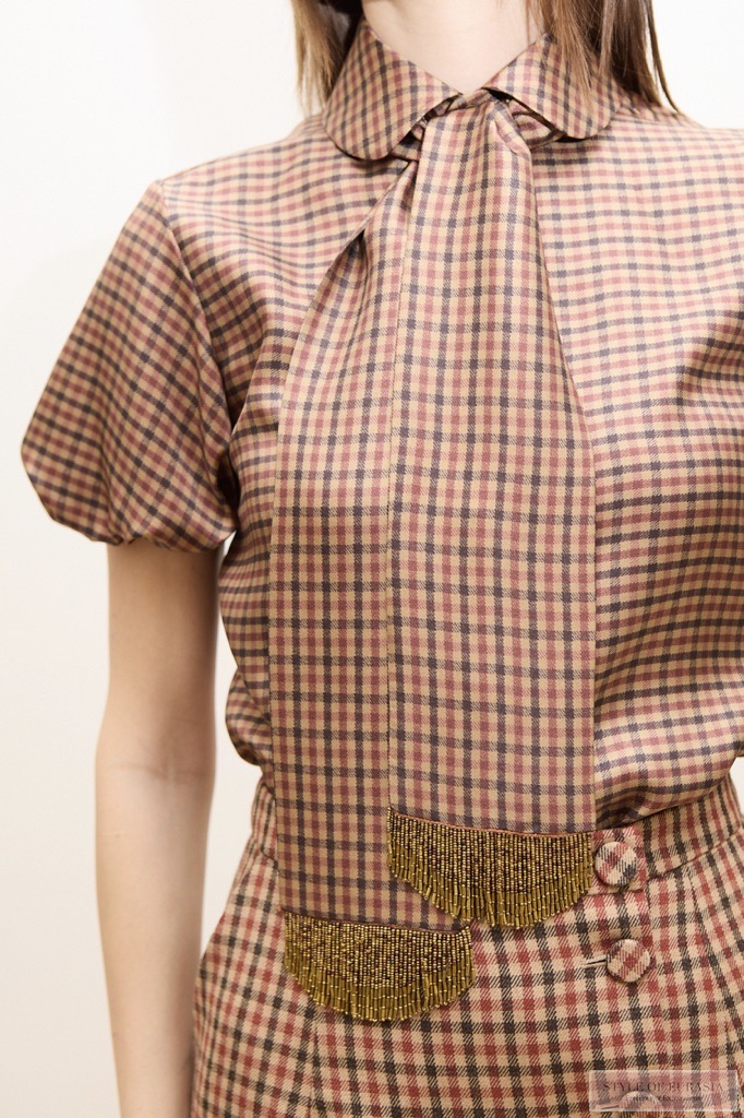Неожиданные детали по-новому переосмысляют привычное: вышивка на воротнике шёлковой рубашки или платье, которое обычно представляют из атласа, но здесь оно выполнено из шерсти в клетку.