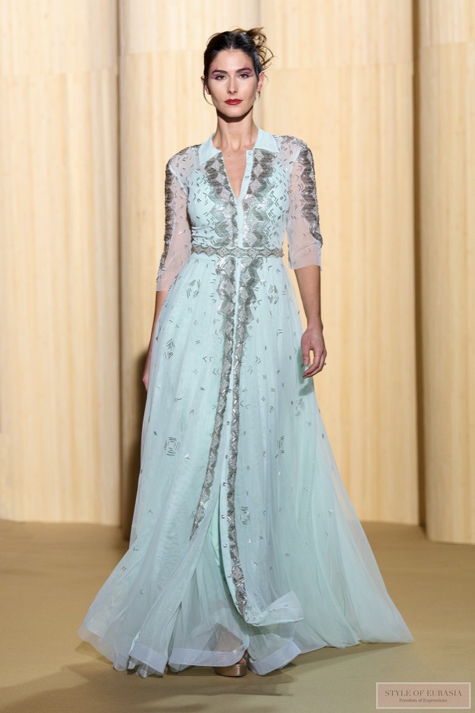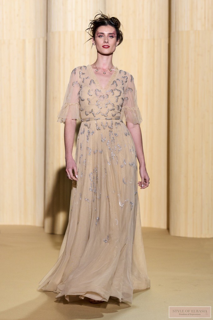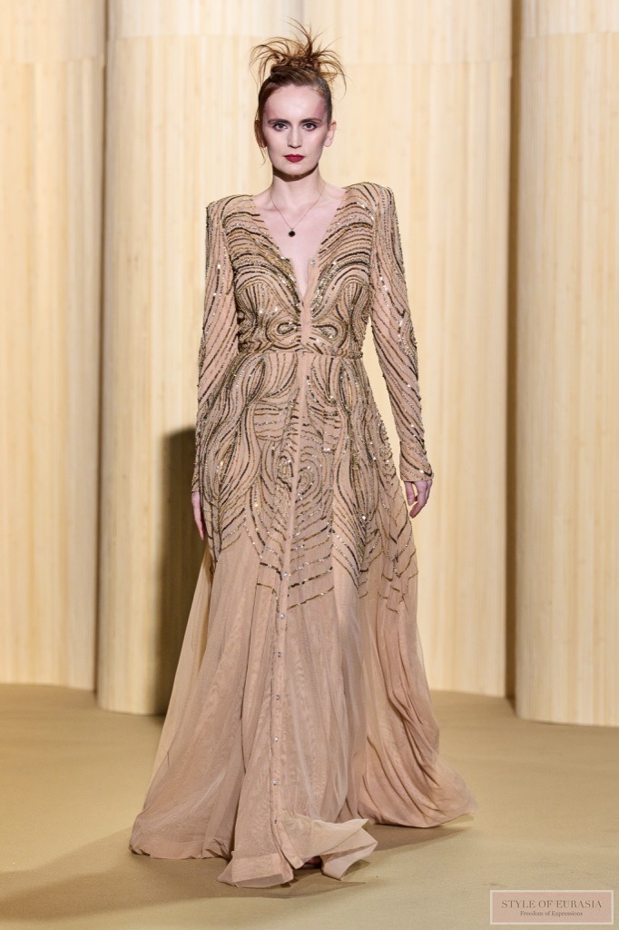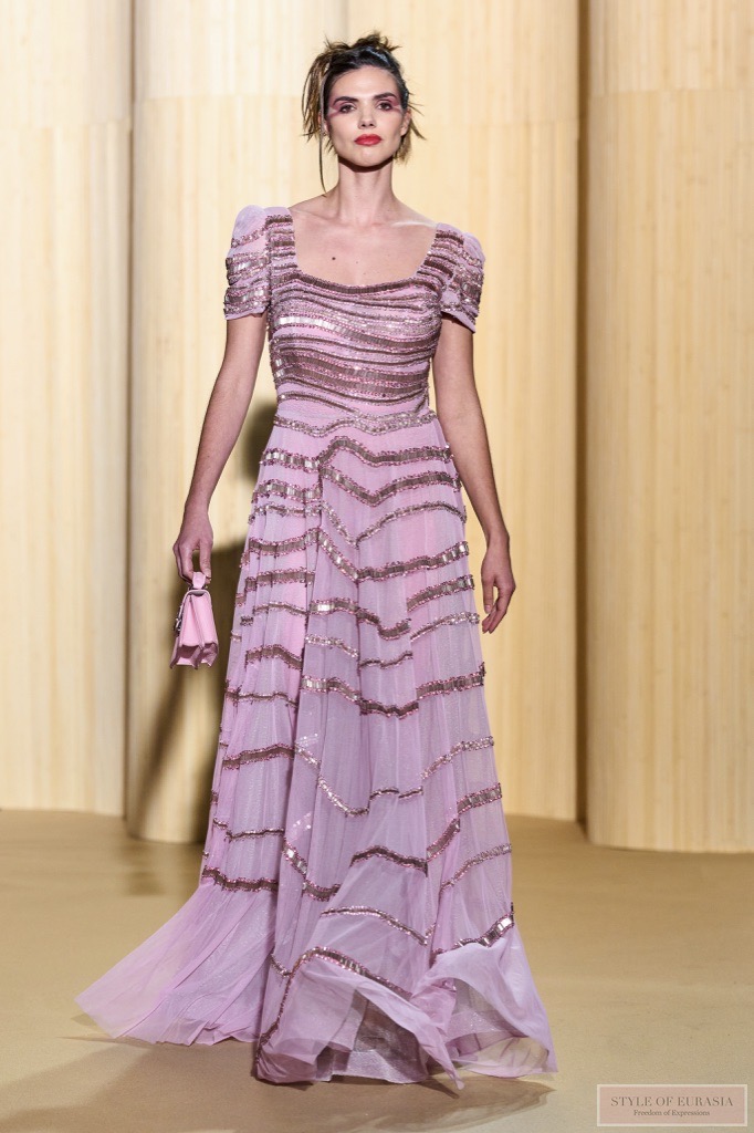 Вышивка из матовых и блестящих трубочек создаёт изысканный эффект полосатой фактуры. Возникает оптическая иллюзия, будто одежда соткана исключительно из света и тени.
