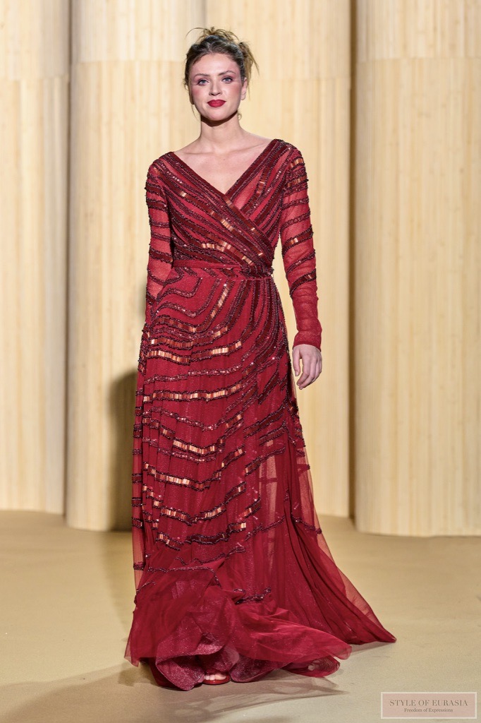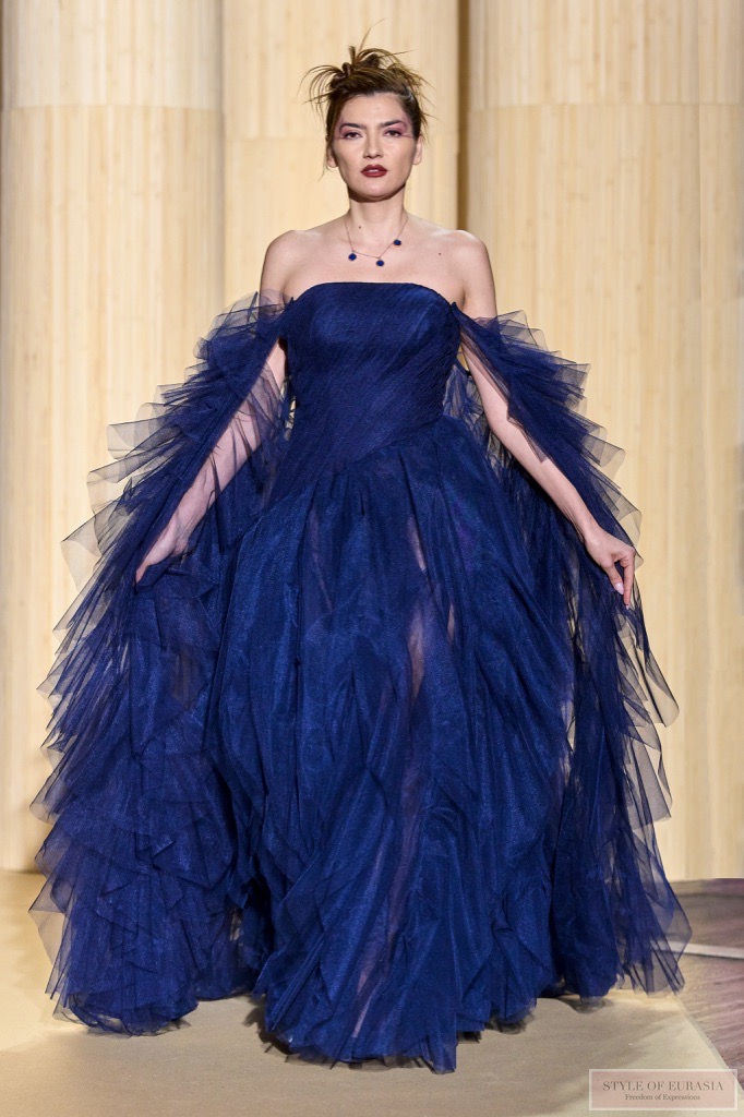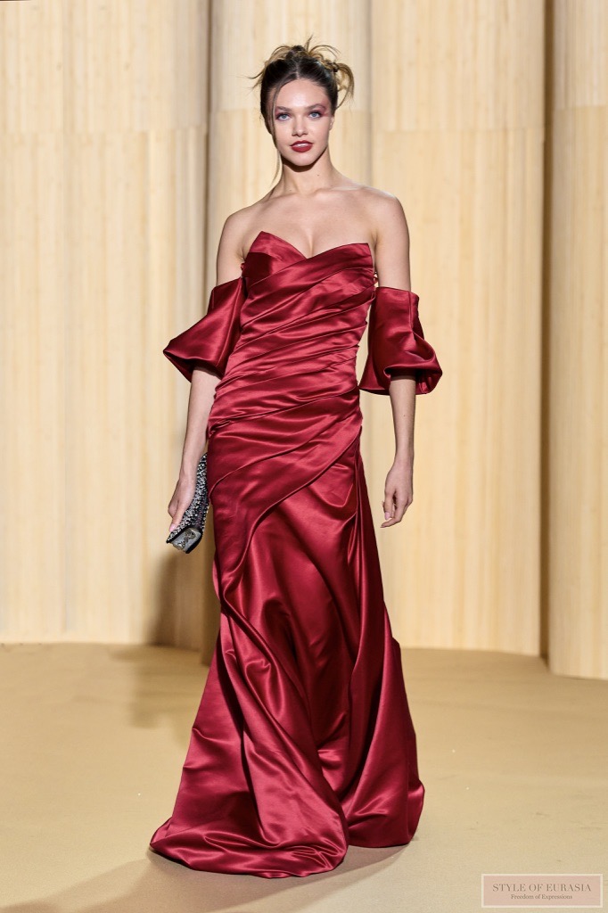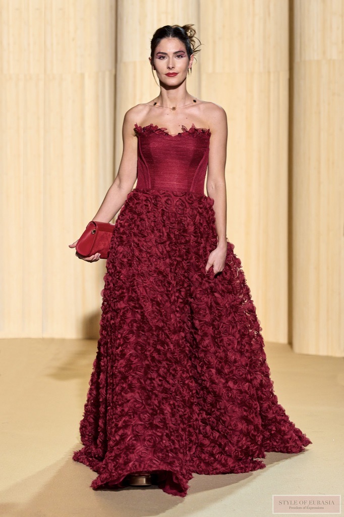 Christophe offers silhouettes with embossed ribbed textures, cascading of multi ruffles, in high contrast.