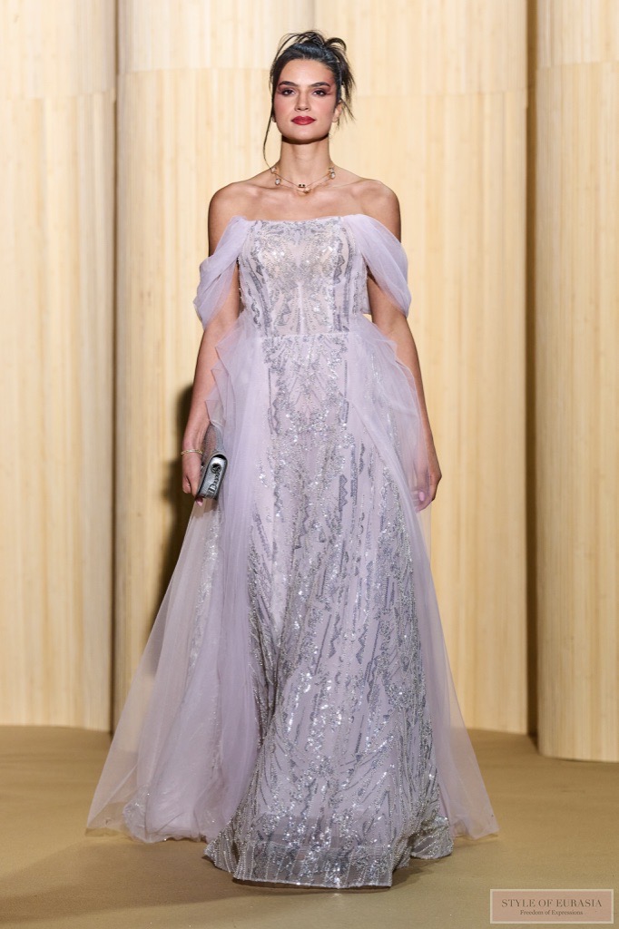 Для своей коллекции осень–зима 2026 дизайнер Кристоф Гийарме вдохновился культовым фильмом «9 ½ недель» и знаменитой сценой стриптиза Ким Бейсингер за жалюзи, где игра неровных полос света и тени перекликается с прерывистым, чувственным ритмом горизонтальных линий.